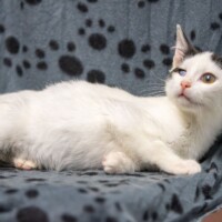 Jego życie też nie oszczędziło… Koci katar zebrał żniwo w postaci uszkodzenia oczu. Lewe oko: Zmiany są bardzo poważne. Rogówka jest zrośnięta ze spojówką na całej powierzchni, co praktycznie uniemożliwia widzenie tym okiem. Nawet przy leczeniu nie ma realnej szansy na odzyskanie normalnego widzenia. Prawe oko: Aktualnie wygląda lepiej – brak zmian w rogówce. To daje nadzieję, że kot będzie w stanie widzieć tym okiem, choć trzeba uważnie leczyć i kontrolować, żeby choroba nie postąpiła.
