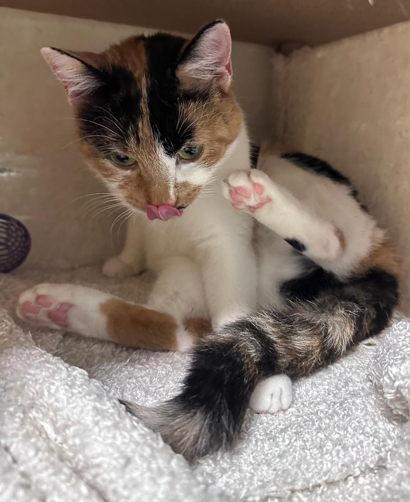 Urodzona w maju 2024r. i łączy w sobie niewyczerpaną energię kociaka z czułością łagodnej towarzyszki. Jest bardzo ciekawska: zawsze jako pierwsza odkrywa każdy nowy kącik i uważnie obserwuje wszystko, co dzieje się wokół. Uwielbia zabawę – każda zabawka w jej łapkach ożywa!