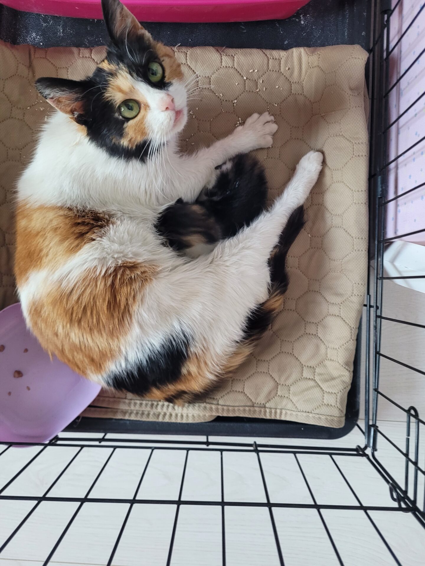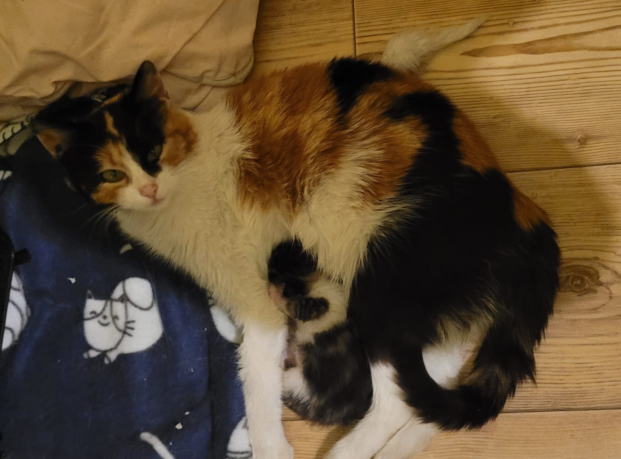 Bajka to dorosła kotka, urodzona w lipcu 2024 roku, o pięknym trójkolorowym umaszczeniu.