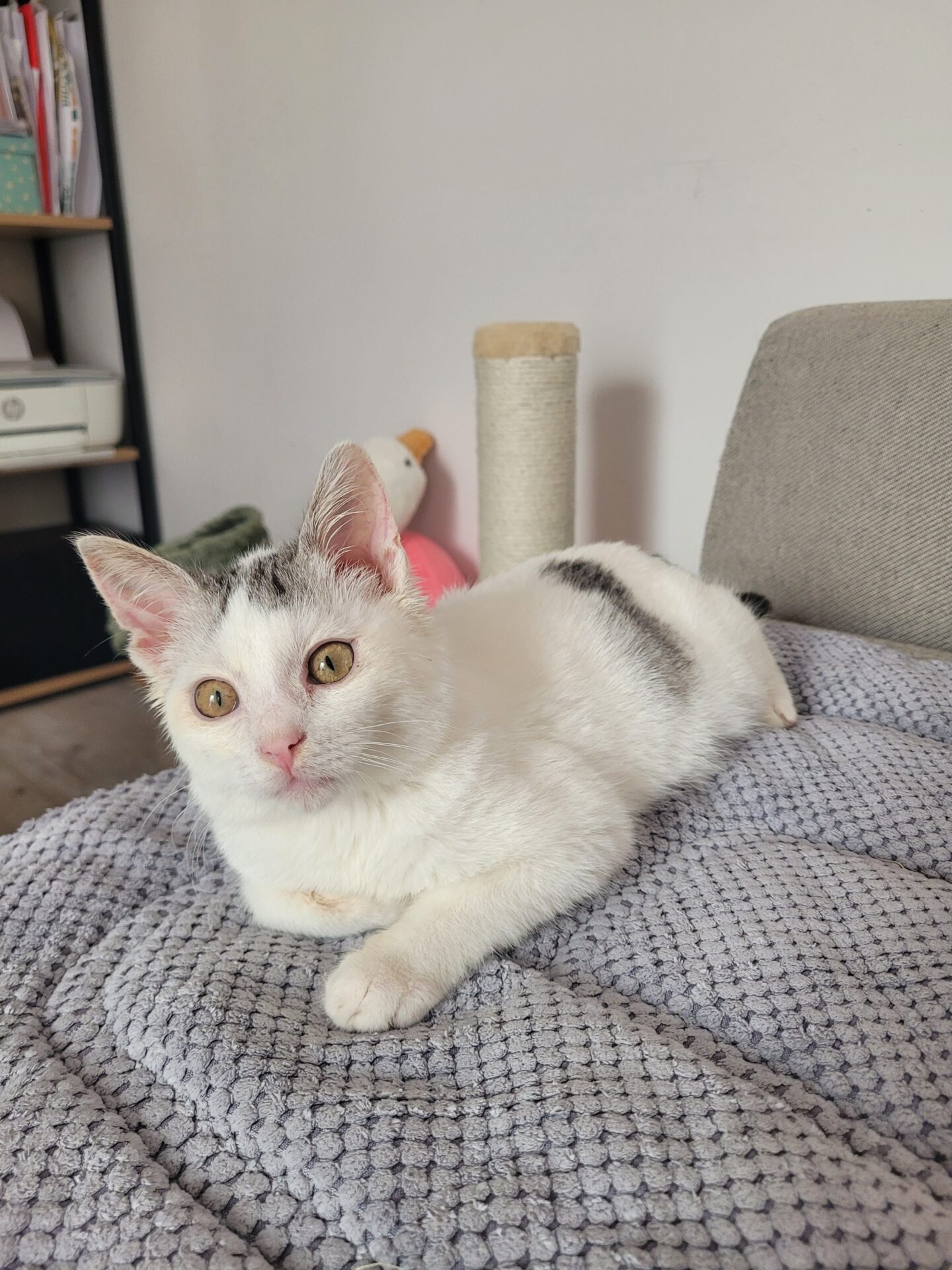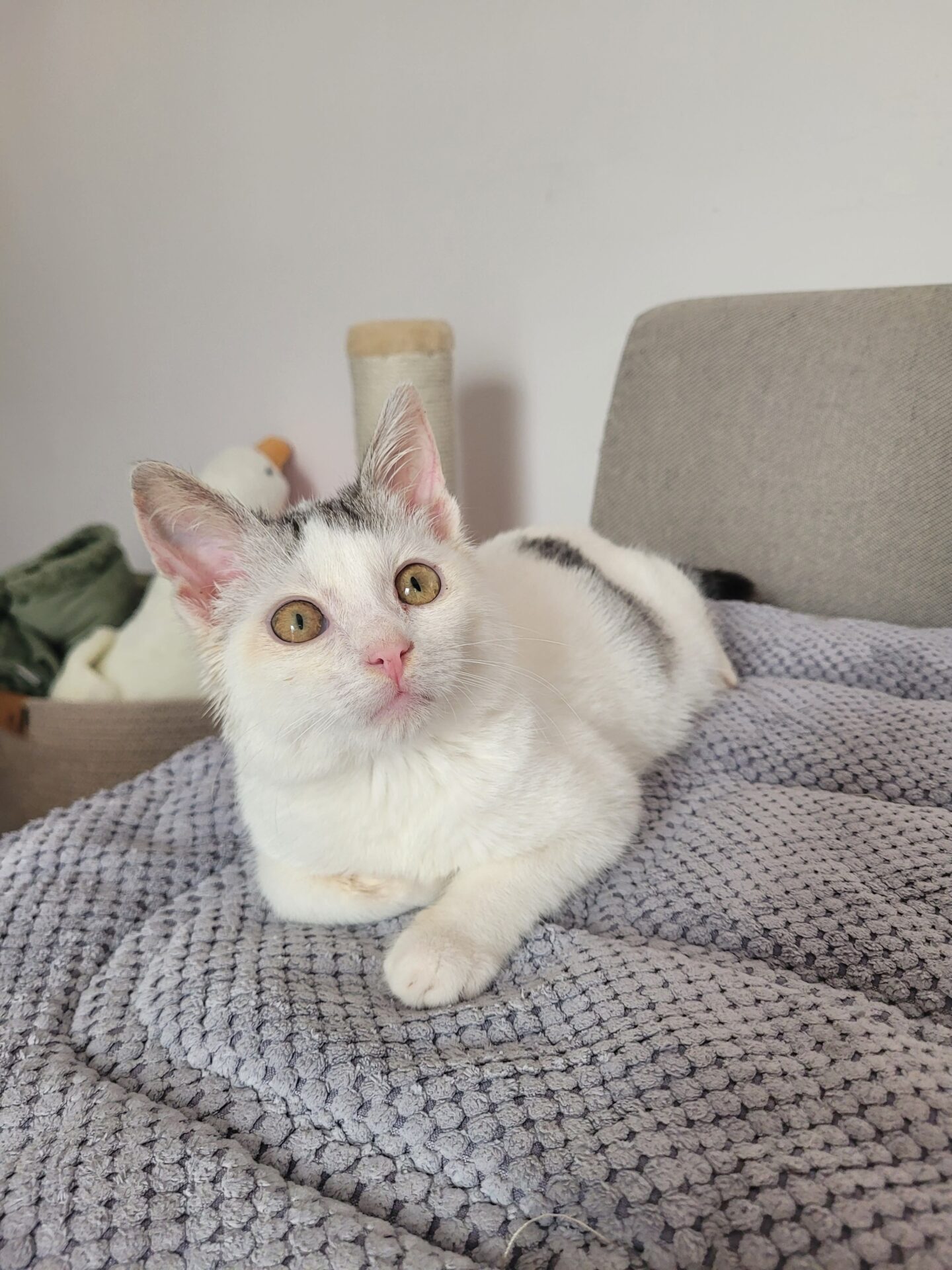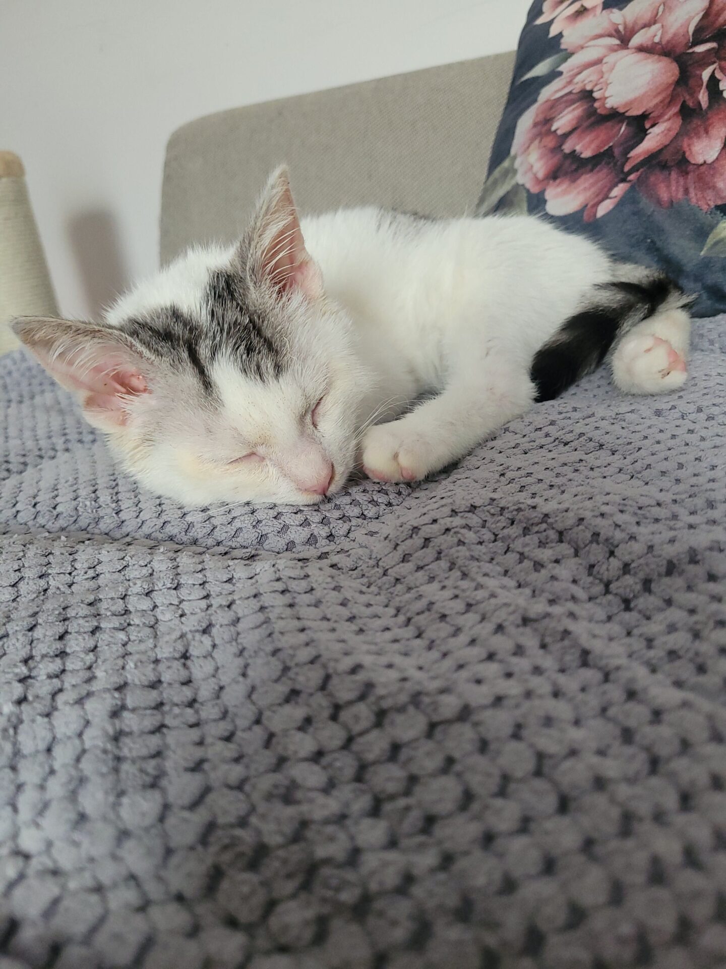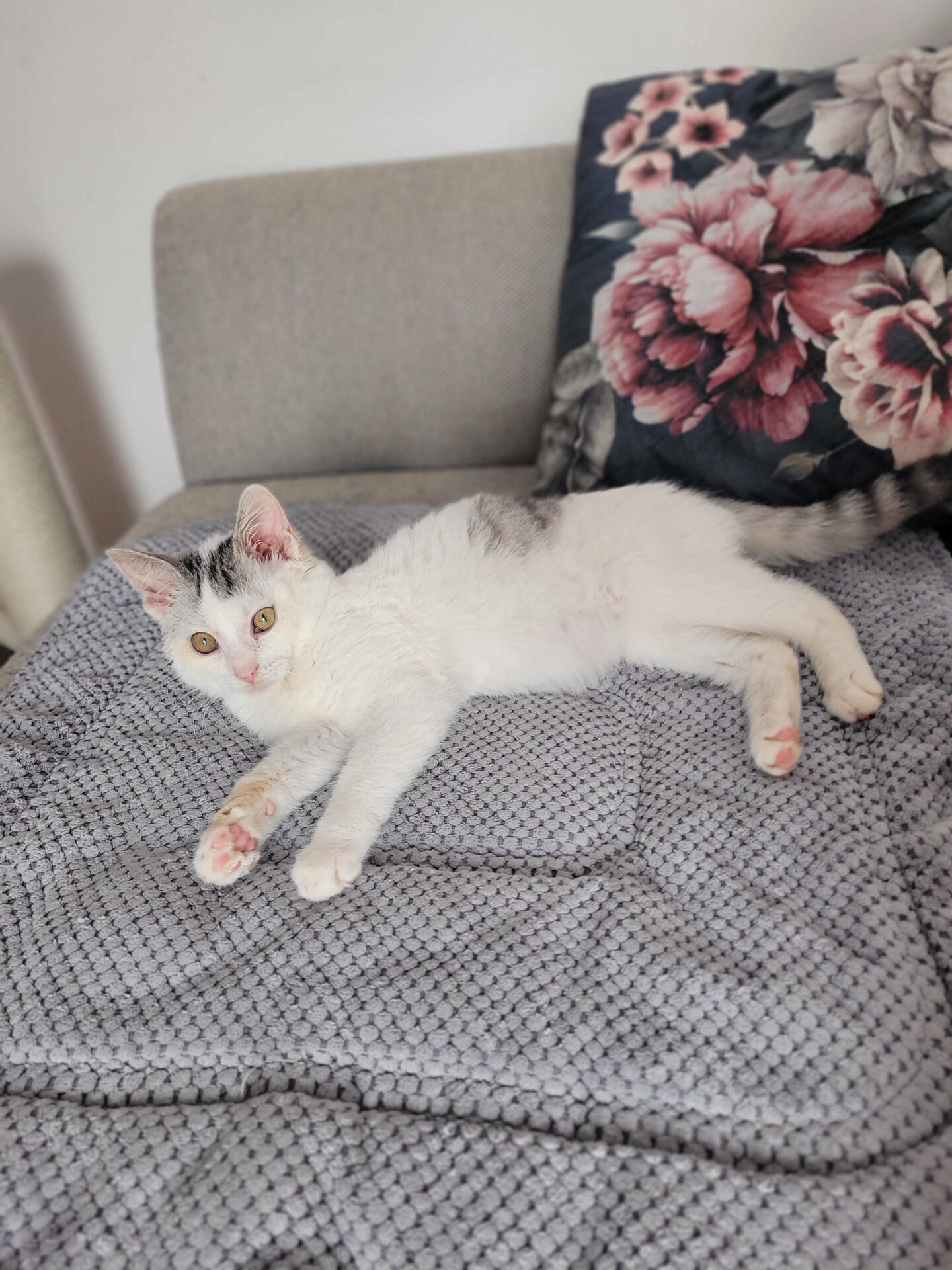 Uwielbia zabawę w ganianego, mruczące drzemki i… dobre jedzonko, które zawsze poprawia mu humor. 🍗😺