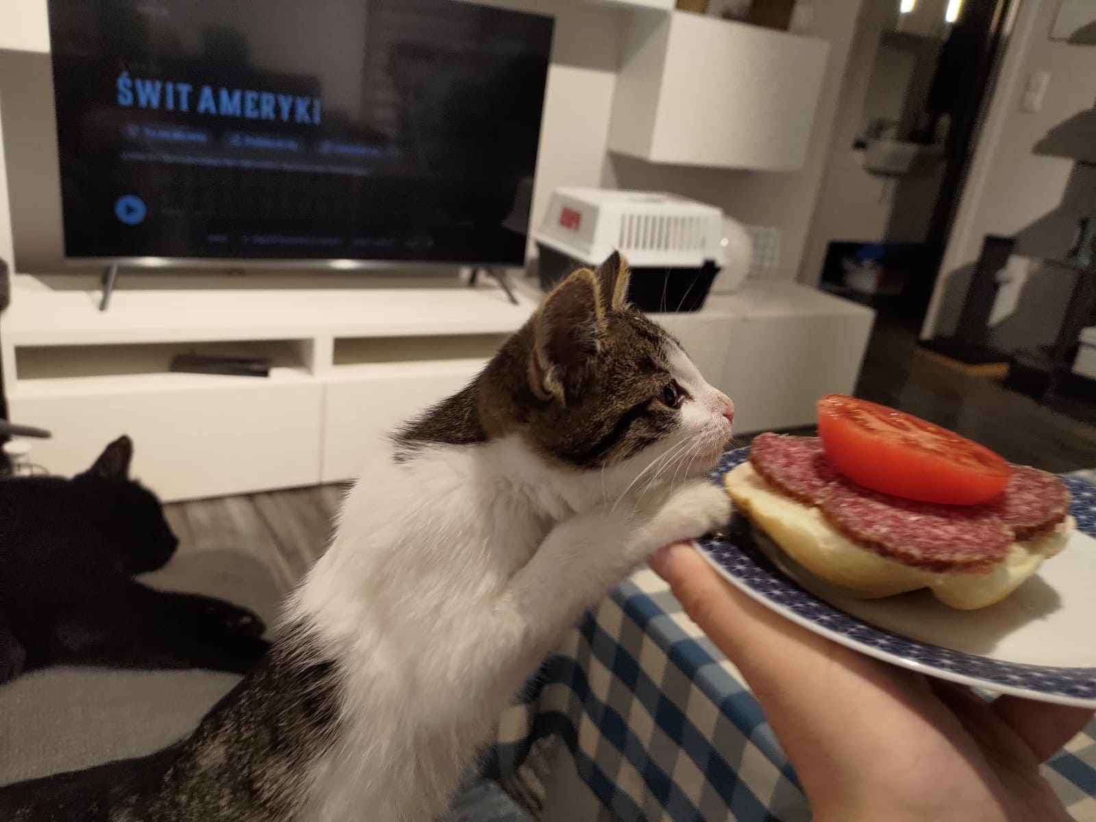 Jem wszystko, kuwetkuję bez problemu, śpię wszędzie – na drapaku, na kolanach, na ramieniu, w bluzie. Obowiązkowe mruczenie!