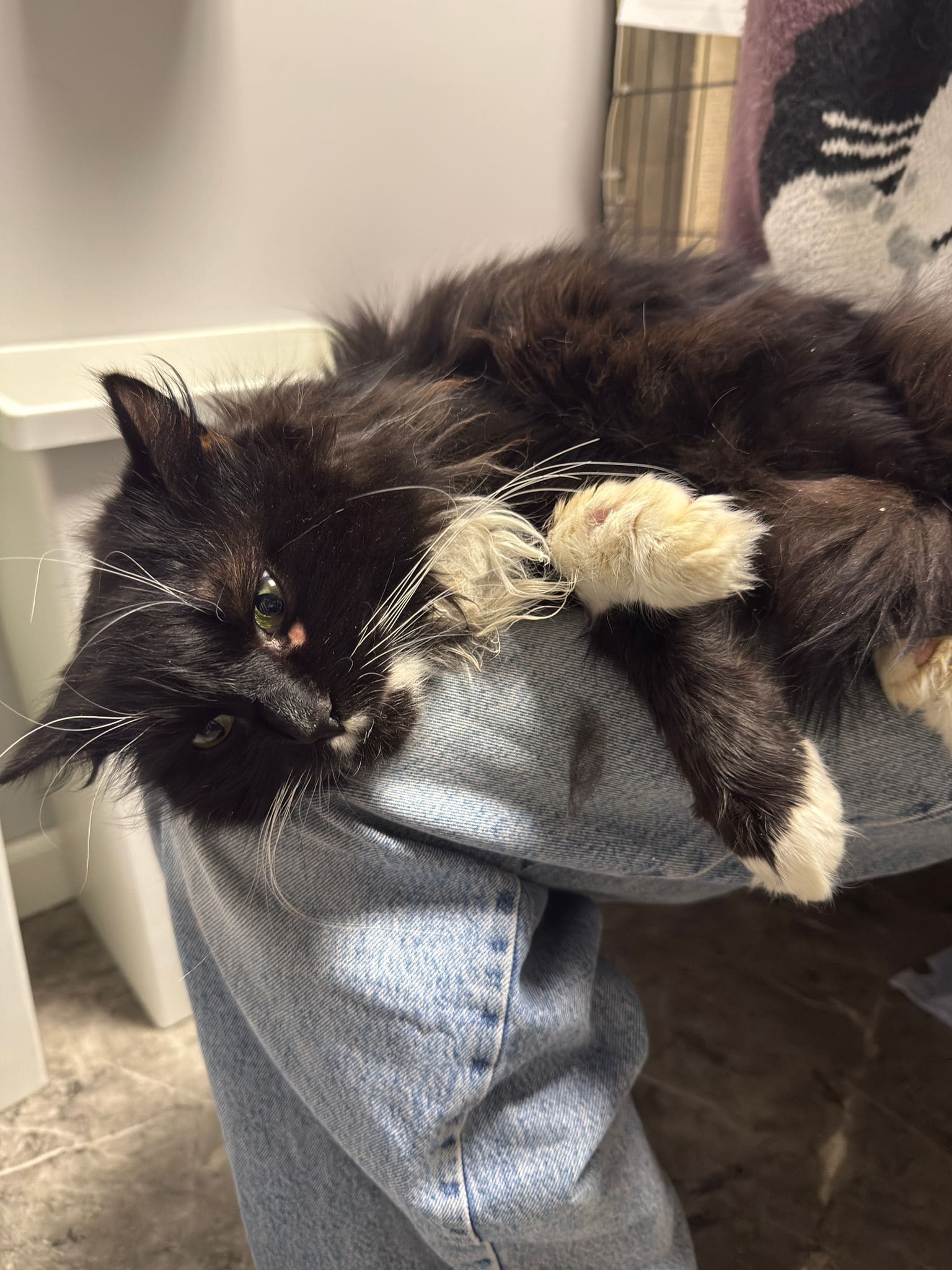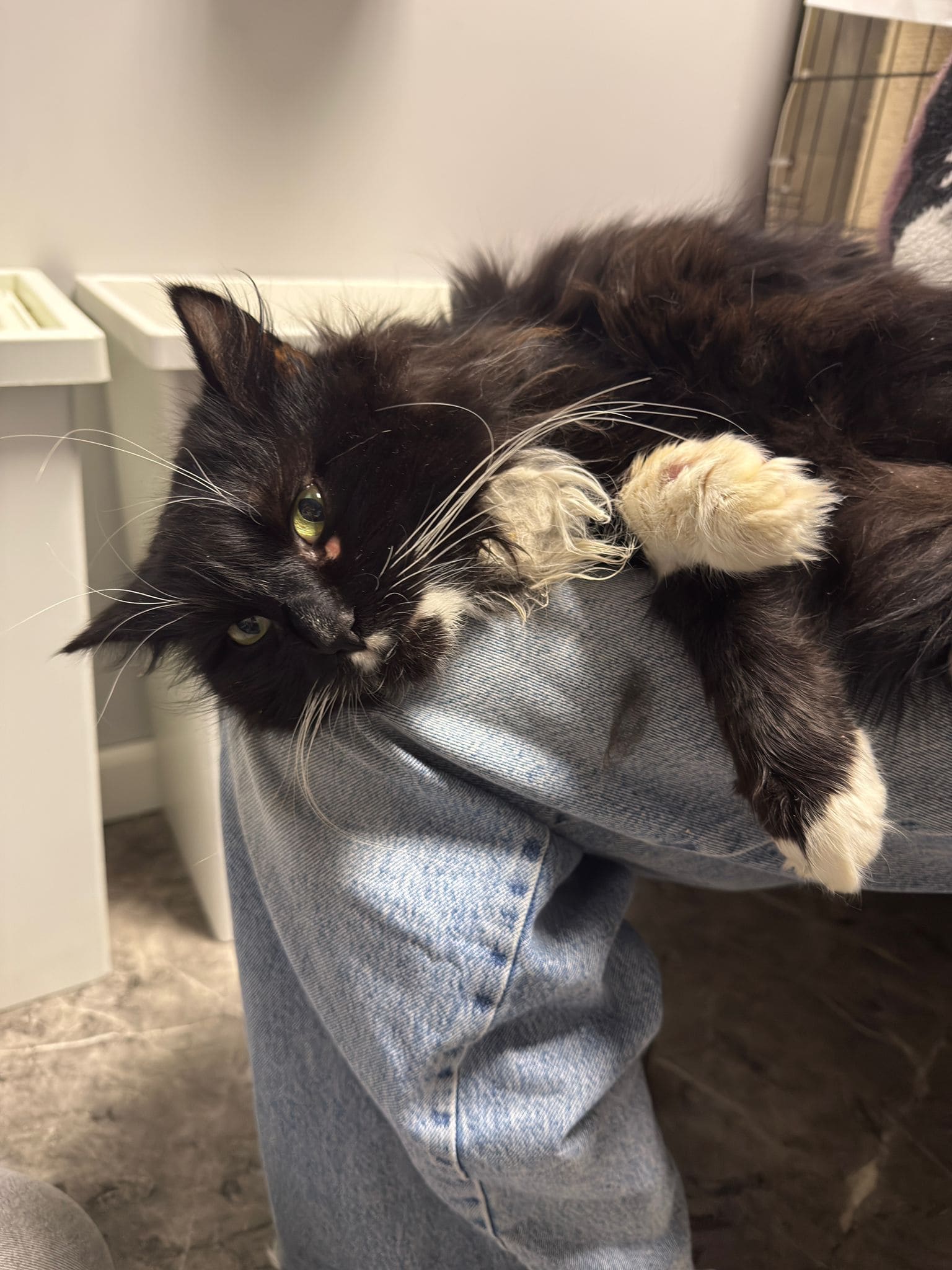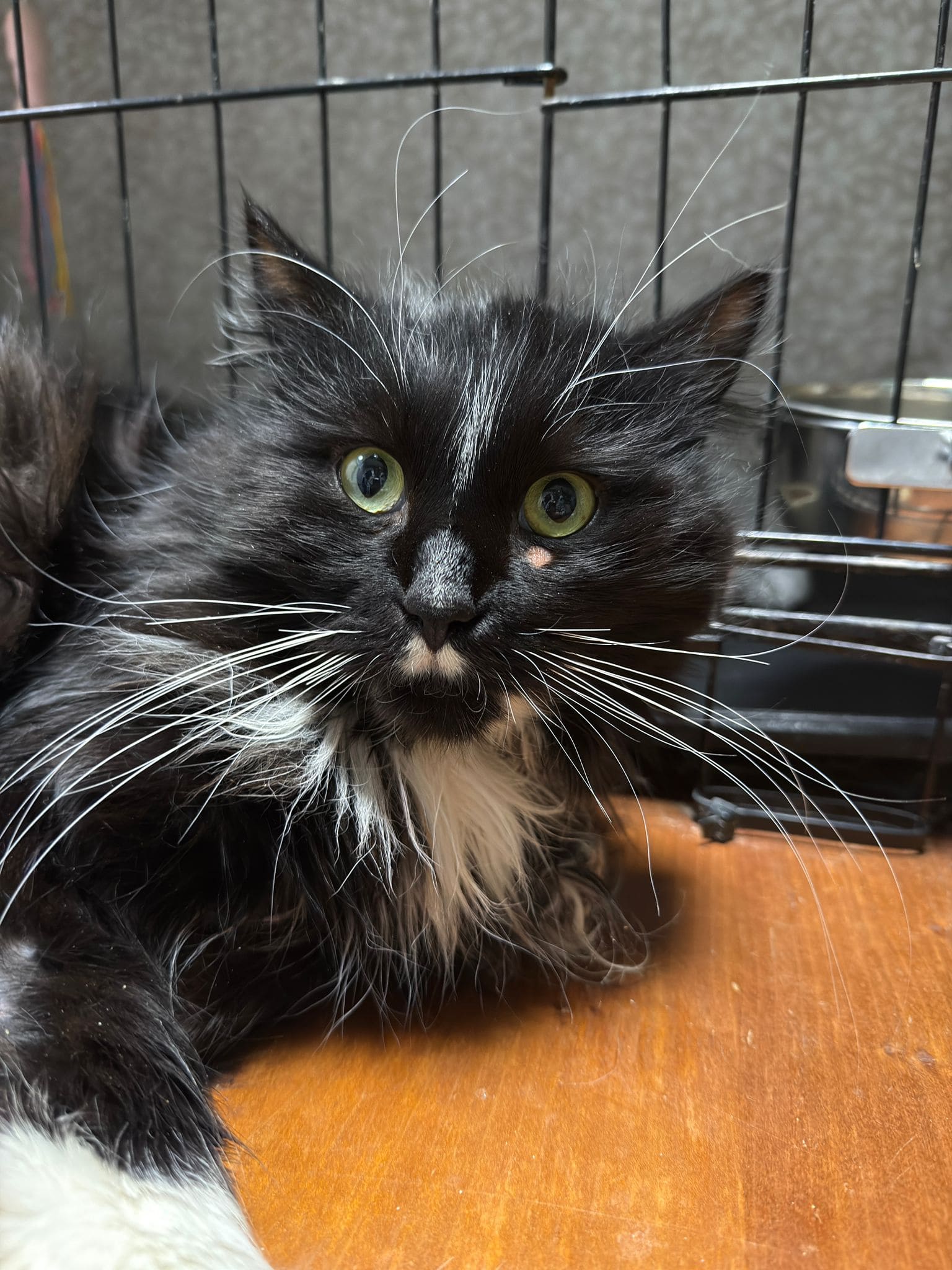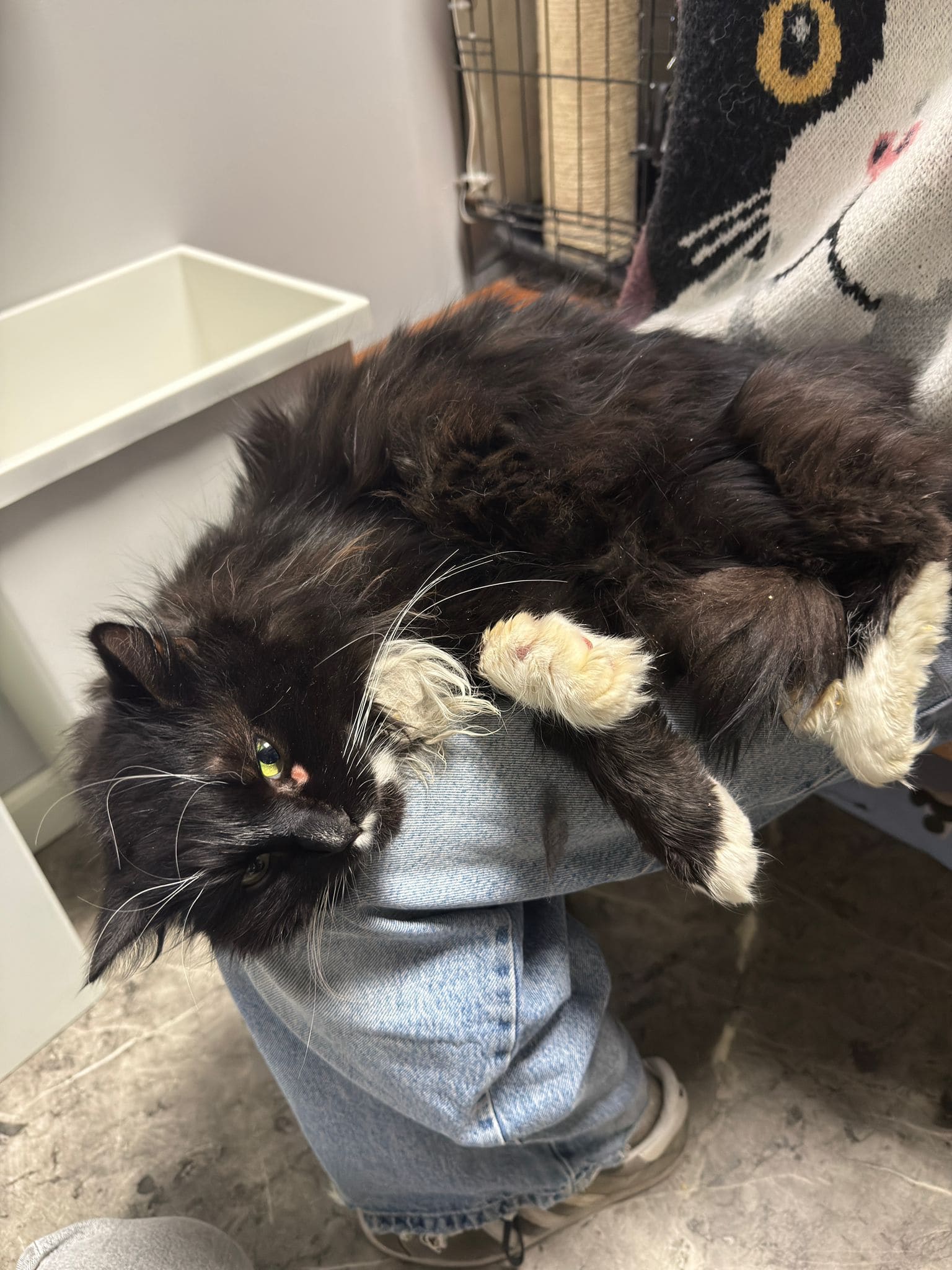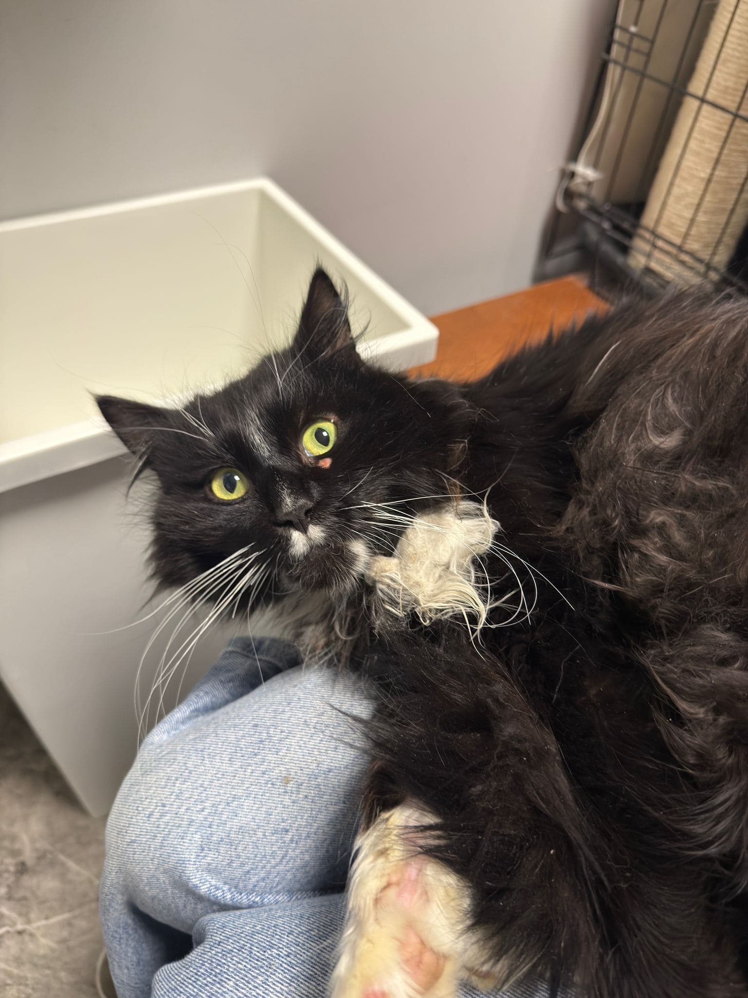 Przyjechał do nas w stanie, który łamał serce. Ból, zaniedbanie i strach – to była jego codzienność. Miał podejrzenie złamanej łapki, świerzb, pchły, kleszcze oraz liczne wyłysienia. Jego sierść była jednym wielkim kołtunem, którego nie dało się już uratować. Dodatkowo brakowało mu podstawowej opieki – nie był szczepiony, odrobaczony ani wykastrowany.