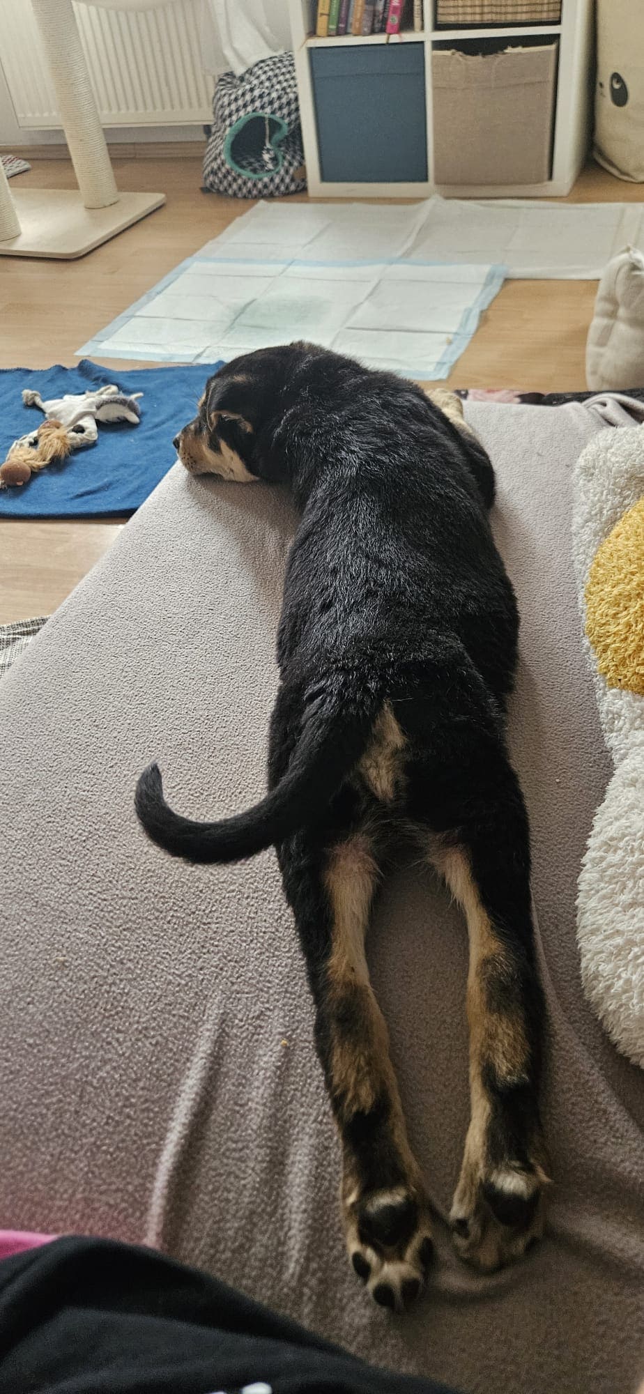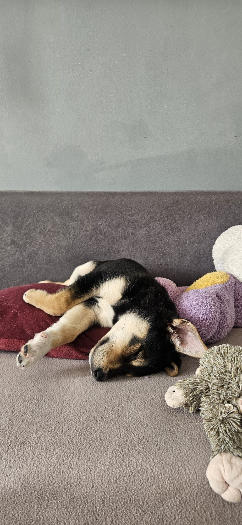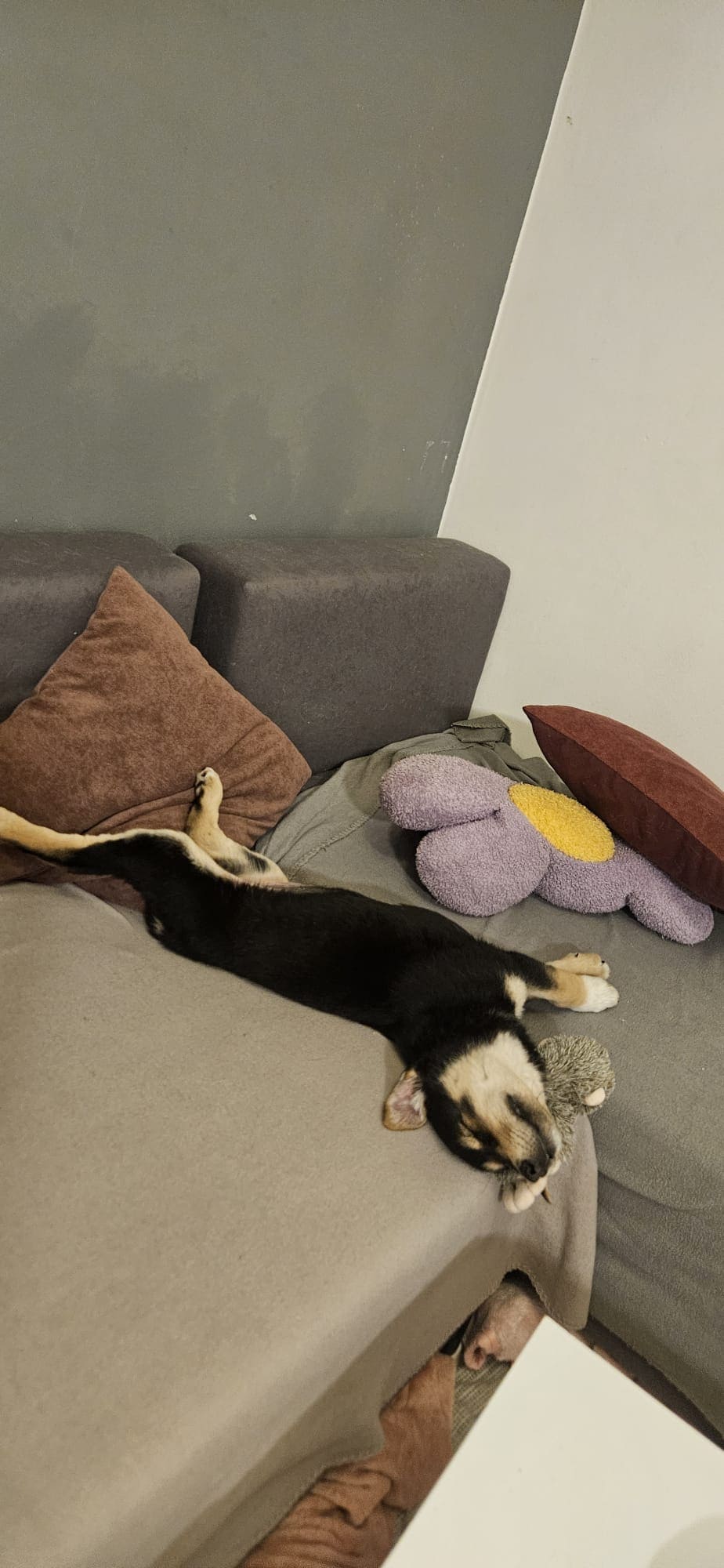 W nowym domu warto podstawić coś miękkiego przy kanapie, ponieważ zdarza jej się zasnąć tak głęboko, że przy obracaniu… spada z niej. 😆